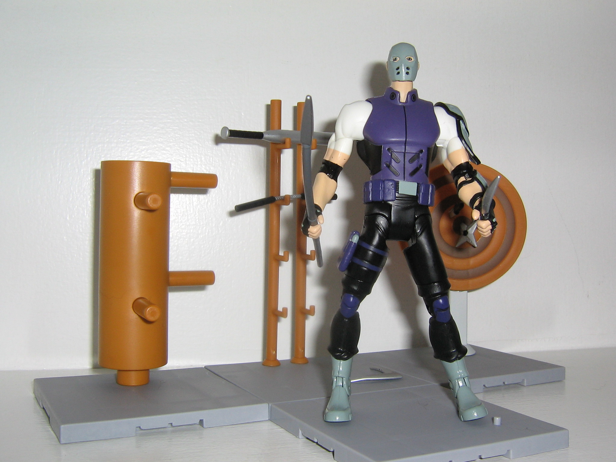 When I say a vast array, let me clarify. He has a baseball bat, boomerang, two throwing stars, two daggers, a spear and nunchuks . These various weapons can be placed on the weapons rack that is attached to the base. The stars and daggers can be firmly placed into the target that is attached to the base or he can hold them and the grip on the weapons worked beautifully.